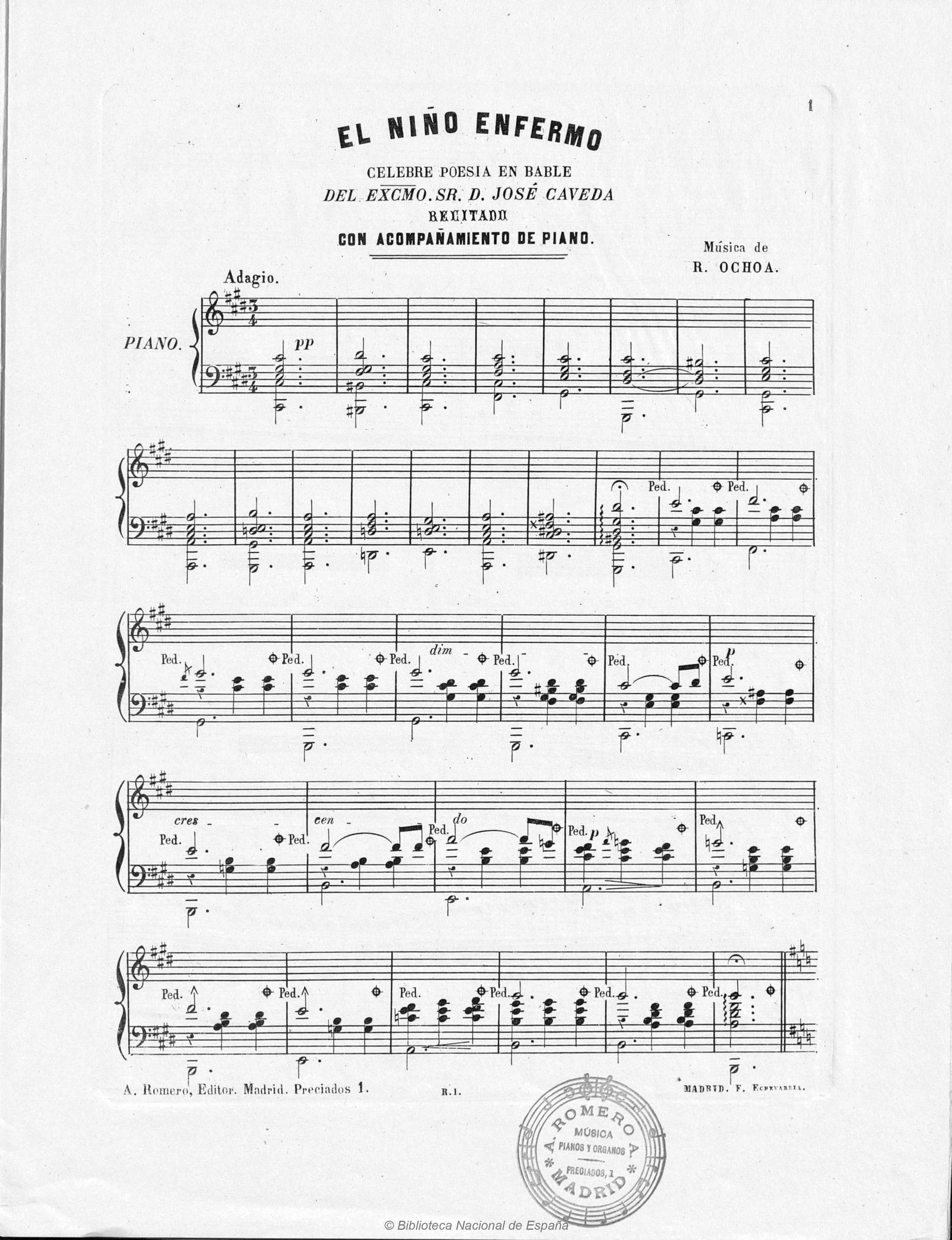 Títulu: El niño enfermo [Música notada] / poesía en bable del Excmo. señor D. José Caveda ; recitada al piano con música de R. Ochoa